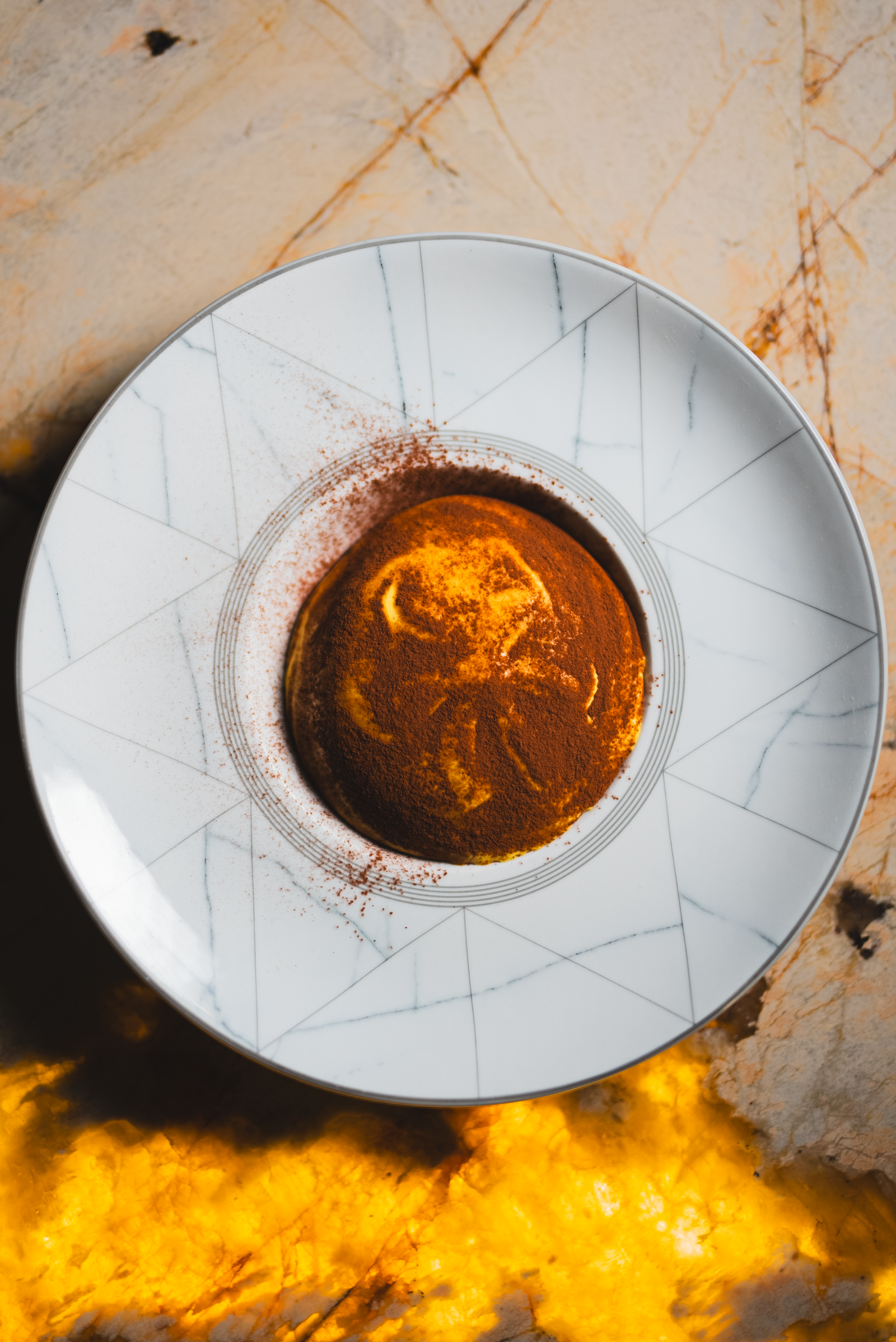 Gazpacho di datterino giallo, cipolla rossa in agrodolce, pesto al prezzemolo e polvere di olive nere